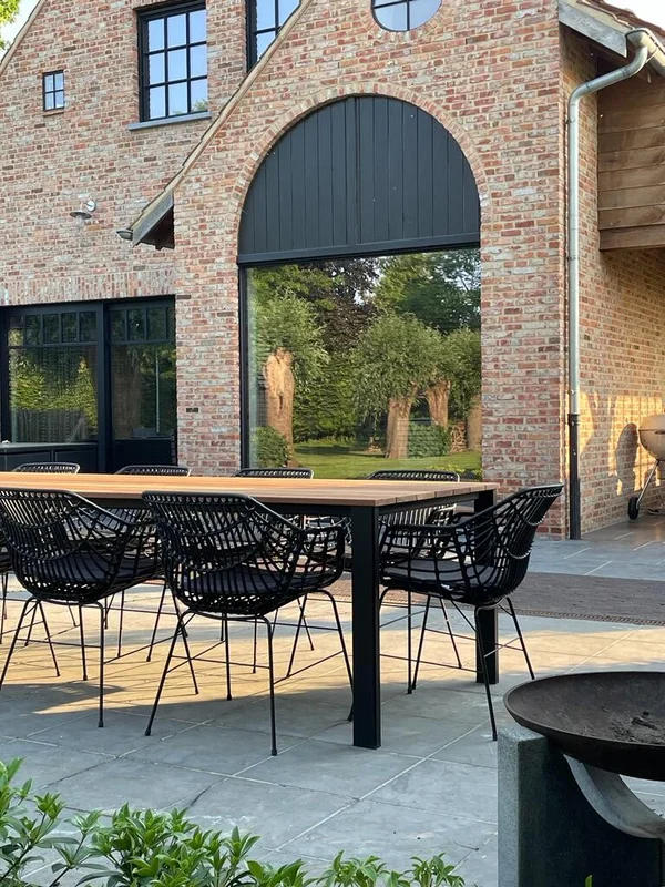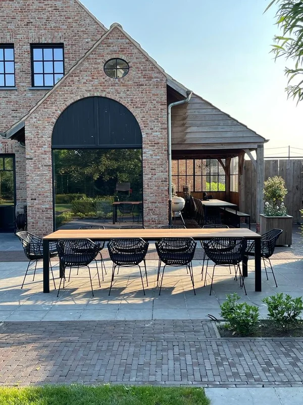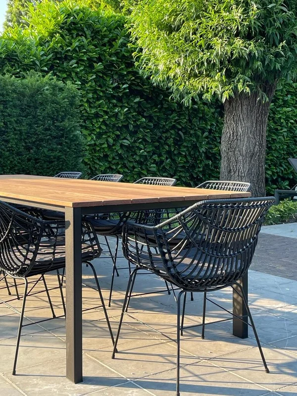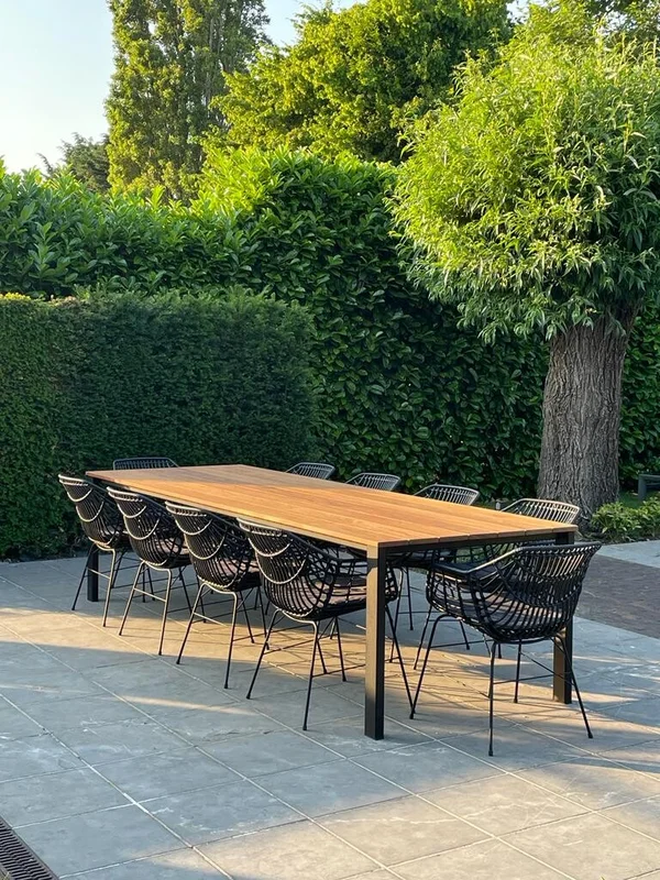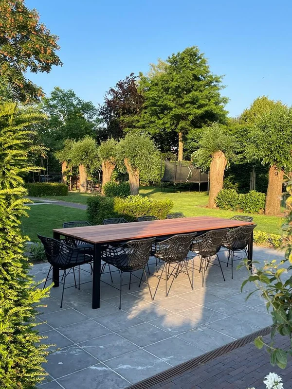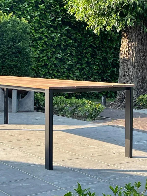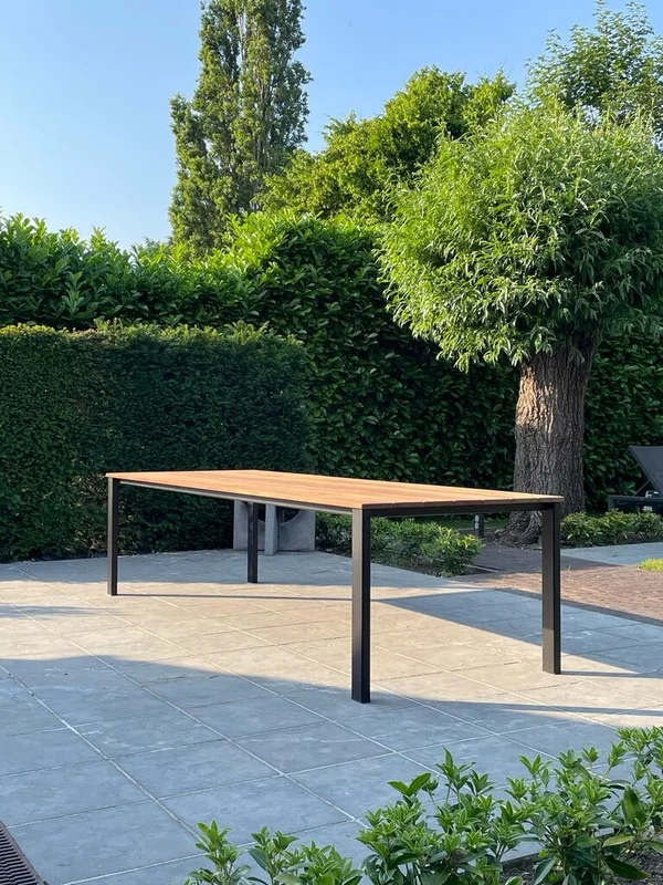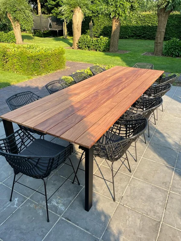 De buitentafel in Cumaru-hout combineert een stijlvolle uitstraling met duurzaamheid. Het blad heeft een dikte van 21 mm en rust op een stevig onderstel van buisprofielen van 80/40 mm. Het onderstel is gemetaliseerd en gepoedercoat voor extra bescherming tegen weersinvloeden. De afgebeelde tafel heeft een afmeting van 300 x 100 cm en een standaardhoogte van 76 cm. Maatwerk is mogelijk om de tafel perfect aan jouw wensen aan te passen.