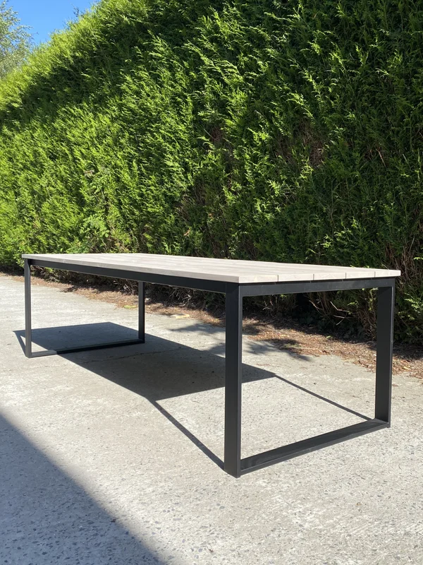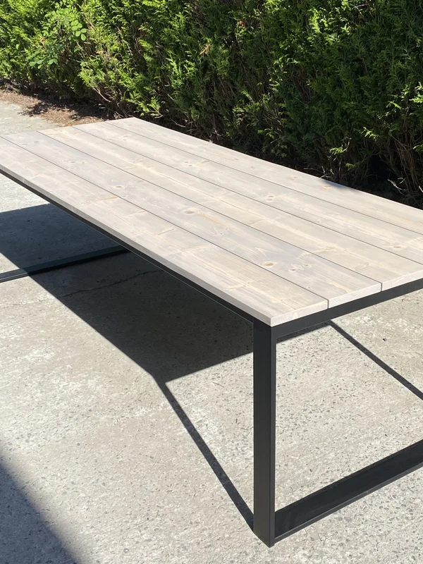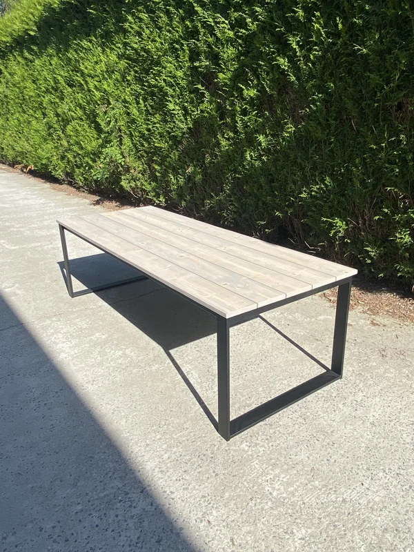 Deze buitentafel is gemaakt van steigerhout en heeft een stevig U-onderstel van 80/20 mm voor een robuuste en stabiele constructie. De afmetingen op de foto zijn 250×100 cm, wat deze tafel ideaal maakt voor grotere tuinruimtes. Het steigerhout is behandeld met een grey wash, wat een stijlvolle, verouderde uitstraling geeft en tegelijkertijd de bescherming tegen de elementen vergroot. Deze tafel voegt een natuurlijke, rustieke charme toe aan elke buitenruimte. Maatwerk is mogelijk, zodat de tafel volledig aan jouw wensen kan worden aangepast.