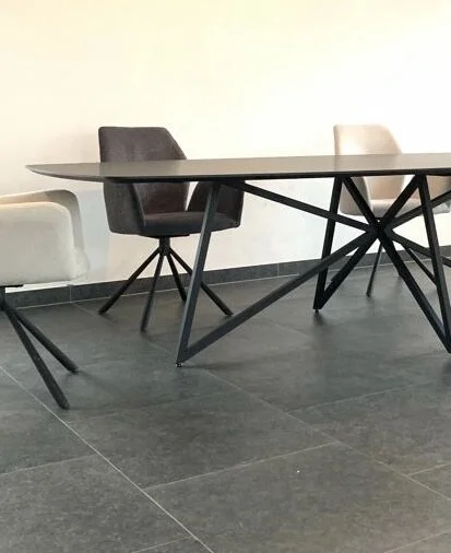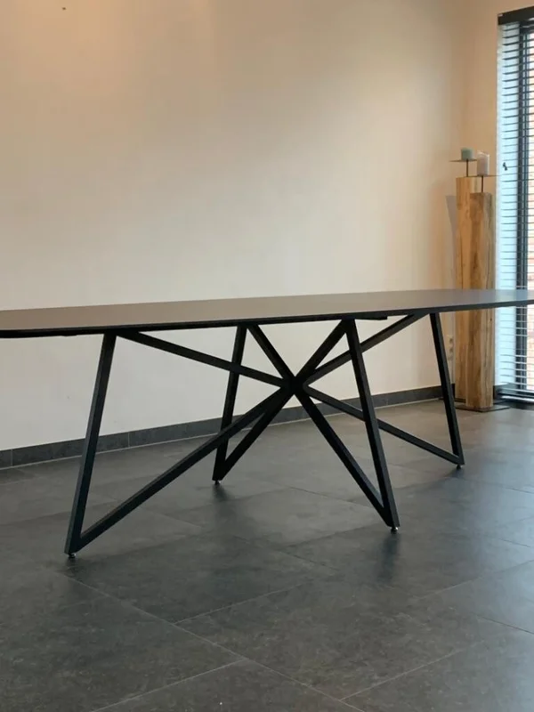 De eettafel Fly Deens Ovaal Fenix heeft een blad van Fenix FNX/MTX, opgedikt met Finse berk en afgewerkt met een toplaag in Fenix HPL NERO INGO (zwart). Het blad is 23 mm dik en heeft een verjongde rand, waardoor het een elegante en moderne uitstraling krijgt. Je kunt kiezen uit meer dan 100 kleuren voor de afwerking, en maatwerk is mogelijk om de tafel aan jouw specifieke wensen aan te passen. De afmetingen op de foto zijn 280×120 cm.
