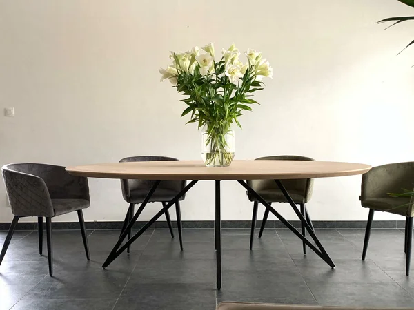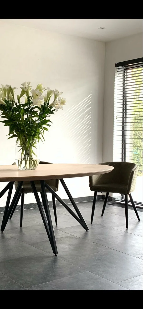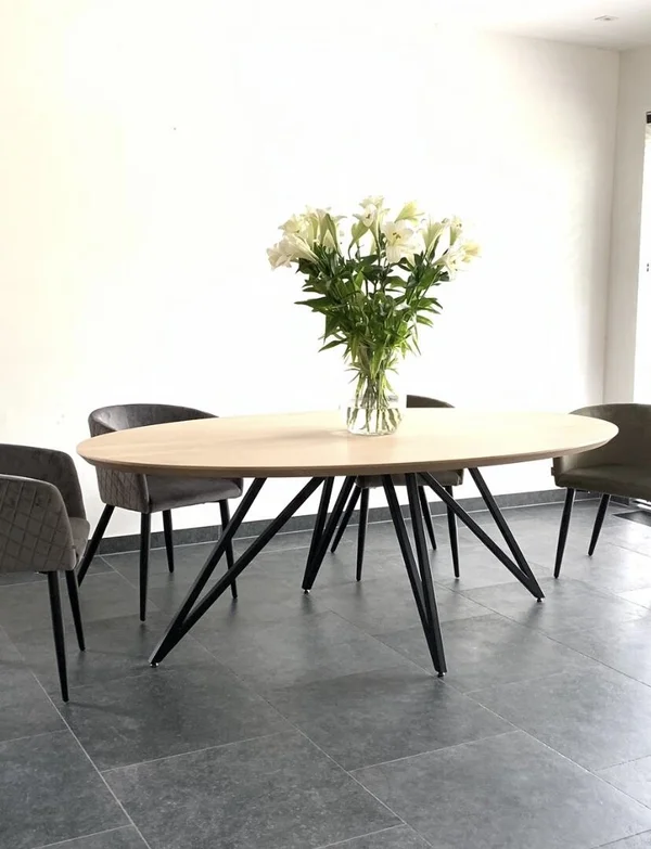 Eettafel Harper Elips in massieve eik. Bladdikte 4 cm met verjongde rand. Blad behandeld met een matte invisible coating. Afmetingen op foto: 240×120 cm. Hoogte 76 cm. Maatwerk mogelijk.
