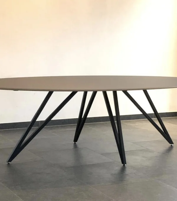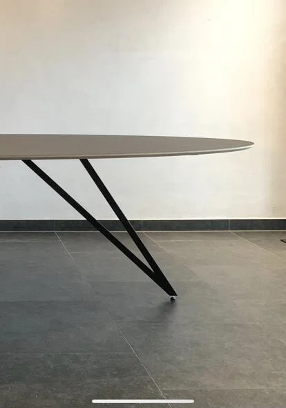 De eettafel Harper ovaal Fenix heeft een blad van Fenix FNX/MTX, opgedikt met Finse berk en afgewerkt met een toplaag in Fenix HPL NERO INGO (zwart). Het blad is 18 mm dik en heeft een verjongde rand voor een strakke, moderne uitstraling. Er is keuze uit meer dan 100 kleuren voor de afwerking, en maatwerk is mogelijk om de tafel perfect te maken voor jouw interieur. De afmetingen op de foto zijn 260×120 cm.
