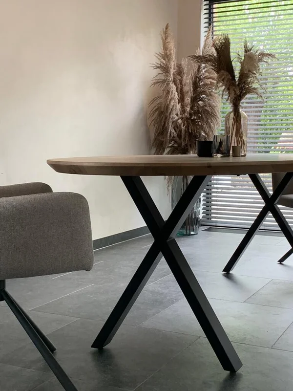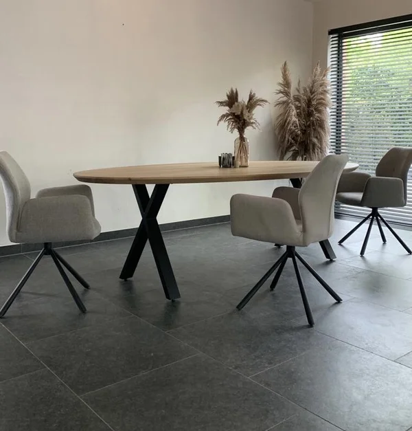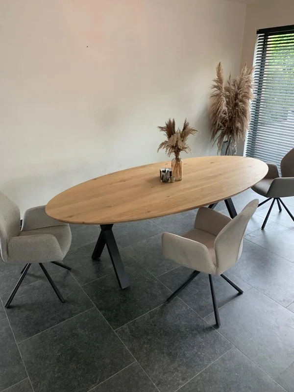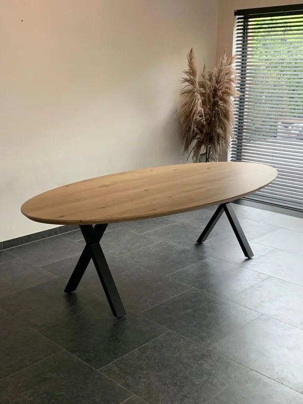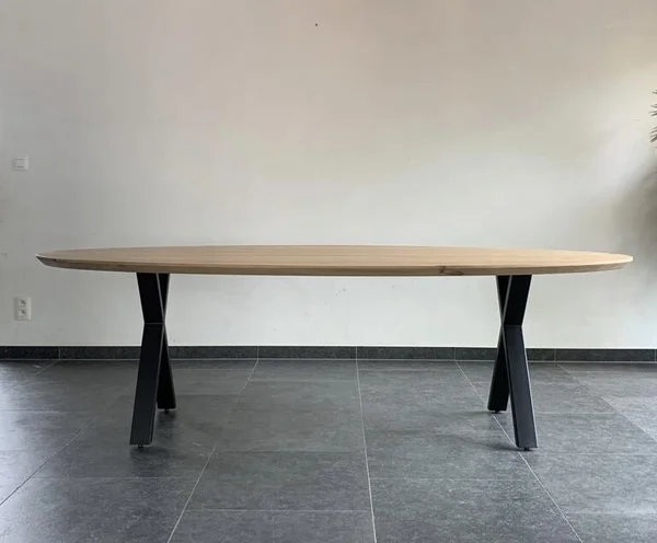 Eettafel in massieve eik ovaal Betran. Bladdikte 4 cm met verjongde rand. Blad behandeld met een 2 componenten coating. Maatwerk mogelijk. Hoogte 76 cm. Afmetingen op foto: 250×120 cm.