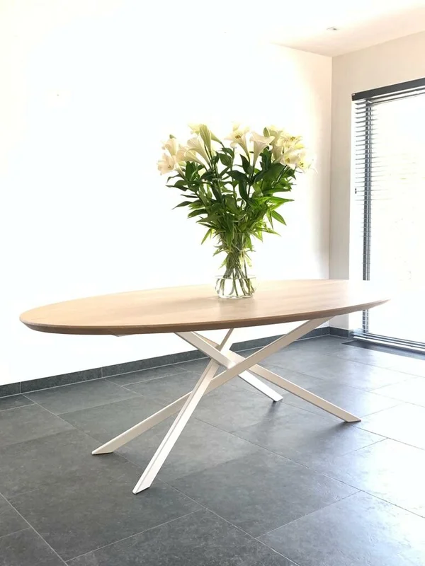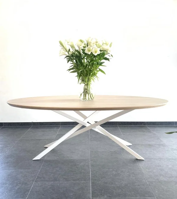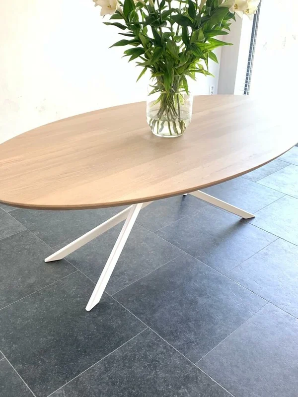 Eettafel Mikado Elips in massieve eik. Bladdikte 4 cm met verjongde rand. Mikado onderstel. Afmetingen op foto: 220×120 cm. Hoogte 76 cm. Maatwerk mogelijk.