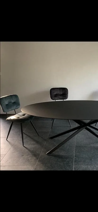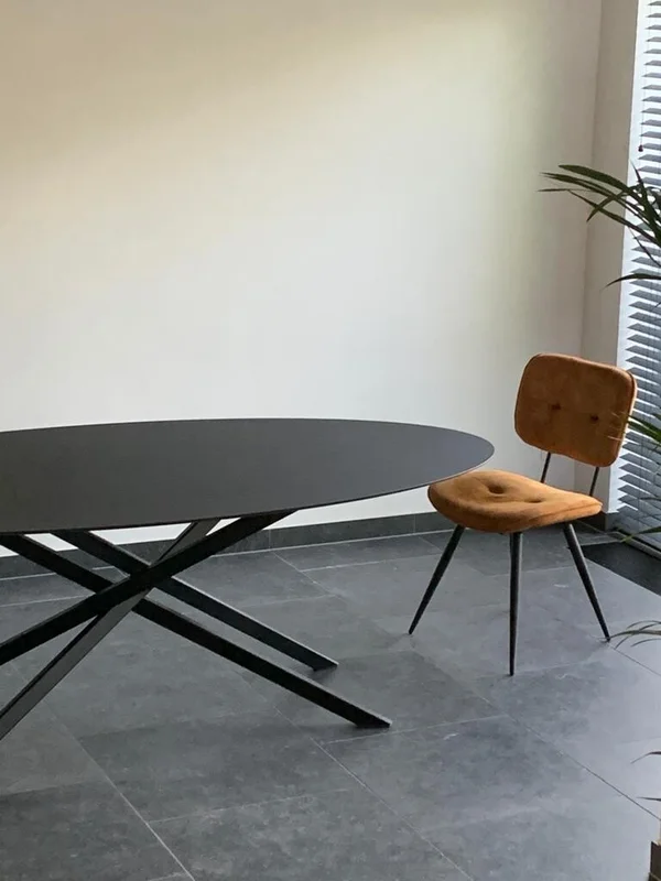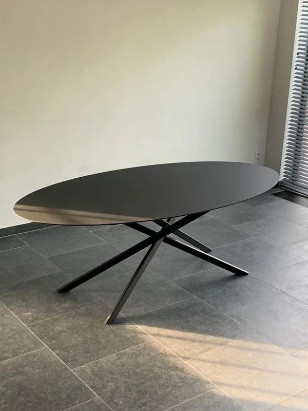 Eettafel Mikado Fenix ovaal, gemaakt van Fenix HPL volkern, met een bladdikte van 12mm en verjongde rand (randafwerking naar keuze). Het blad is zwart (Nero Ingo), krasbestendig en matte afwerking. Maatwerk mogelijk om het perfect aan jouw interieur aan te passen.