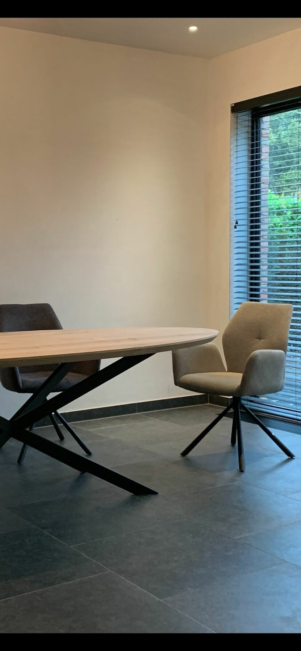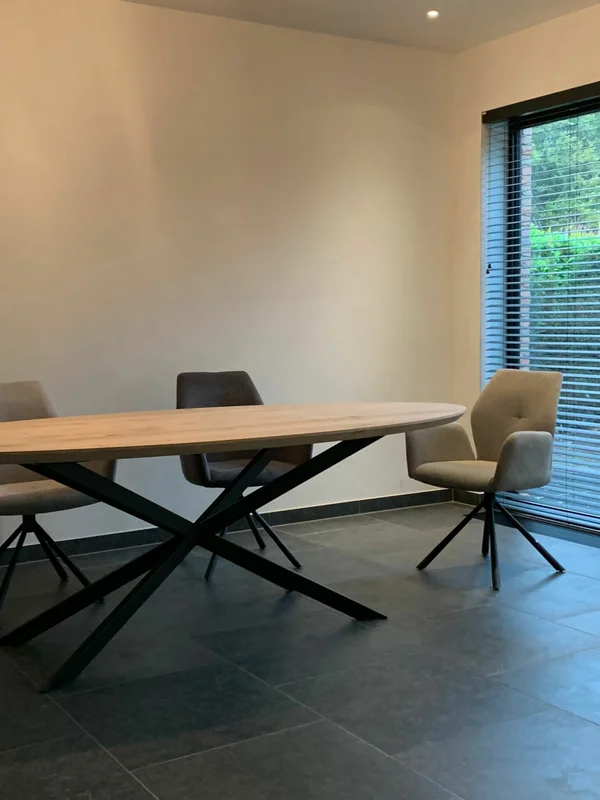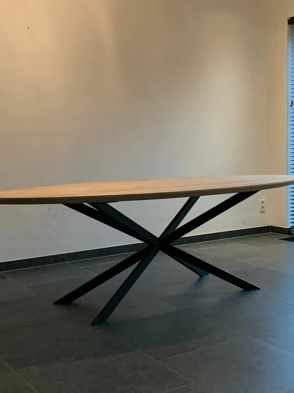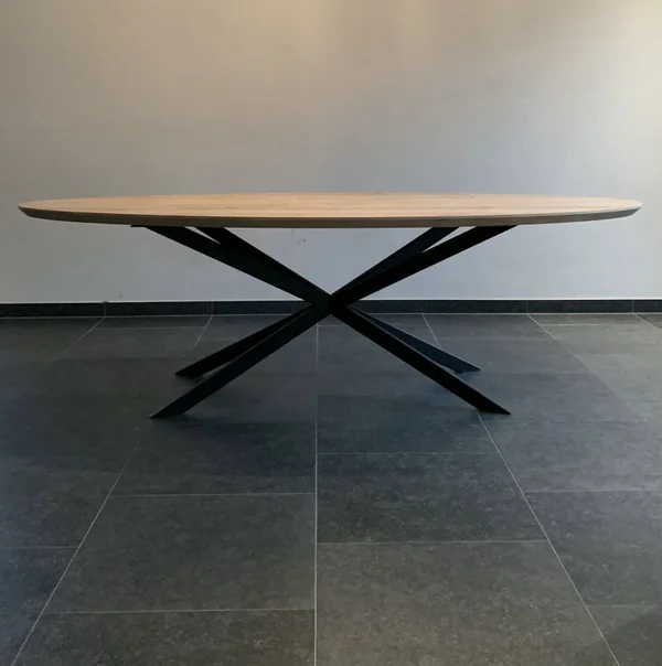 Eettafel Ovaal Falke in massieve eik. Bladdikte 4 cm met verjongde rand. Afmetingen op foto: 240×110 cm. Blad behandeld met een 2-componenten coating (vet- en waterafstotend). Hoogte 76 cm. Onderstel gepoederlakt. Maatwerk mogelijk.
