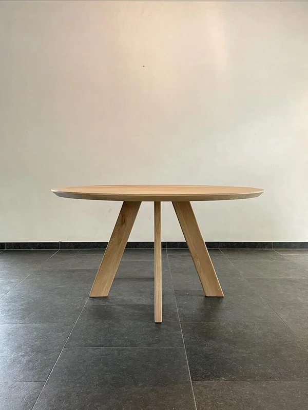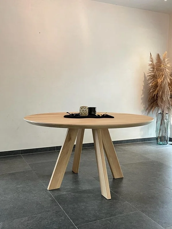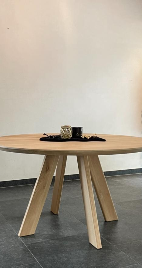 Eettafel Pino. Eettafel in massieve eik. Poten in massieve eik. Bladdikte 4 cm met verjongde rand. Behandeld met een 2 componenten coating. Maatwerk mogelijk.