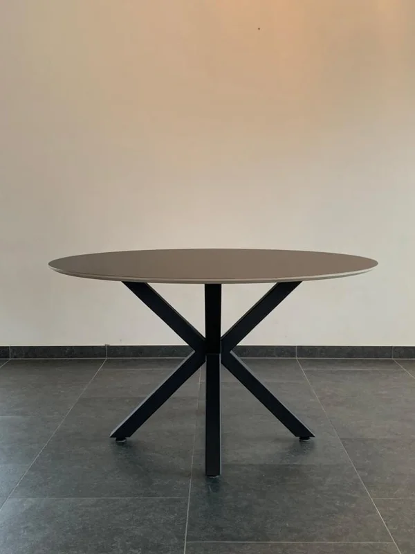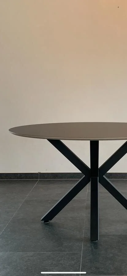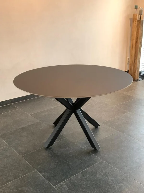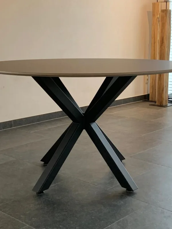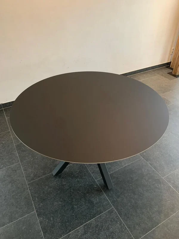 De eettafel rond 3D Fenix heeft een blad van Fenix FNX/MTX opgedikt met Finse berk, met een toplaag in Fenix HPL NERO INGO (zwart). Het blad is 18 mm dik en heeft een verjongde rand. Je kunt kiezen uit meer dan 100 kleuren voor de afwerking. Maatwerk is mogelijk om de tafel volledig naar wens te maken. De diameter op de foto is 130 cm.