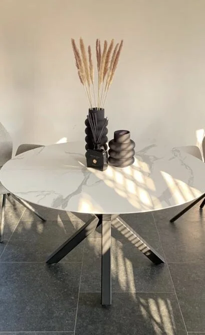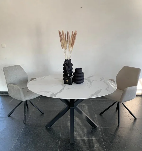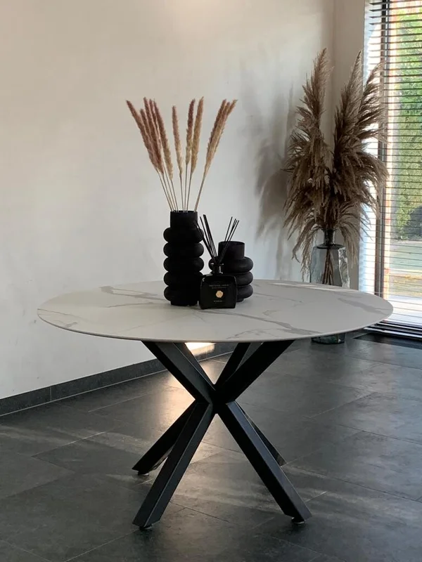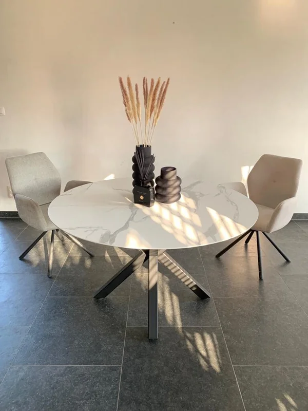 De eettafel rond Fenix 3D heeft een Fenix HPL volkern blad van 12 mm dik, afgewerkt met een verjongde rand. De randafwerking is naar keuze. Het blad heeft een marmerlook in de kleur 3493 KER. Maatwerk is mogelijk om de tafel naar wens aan te passen.