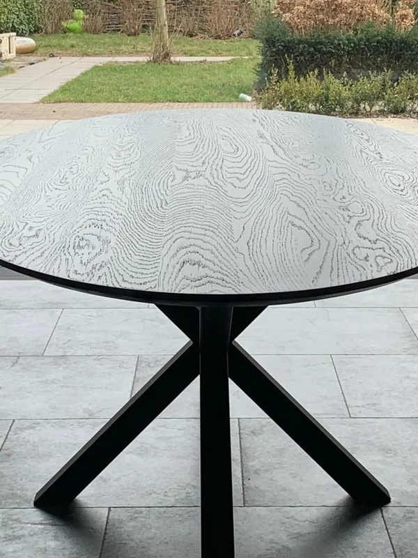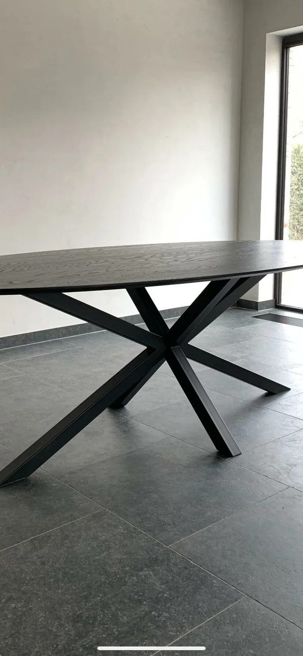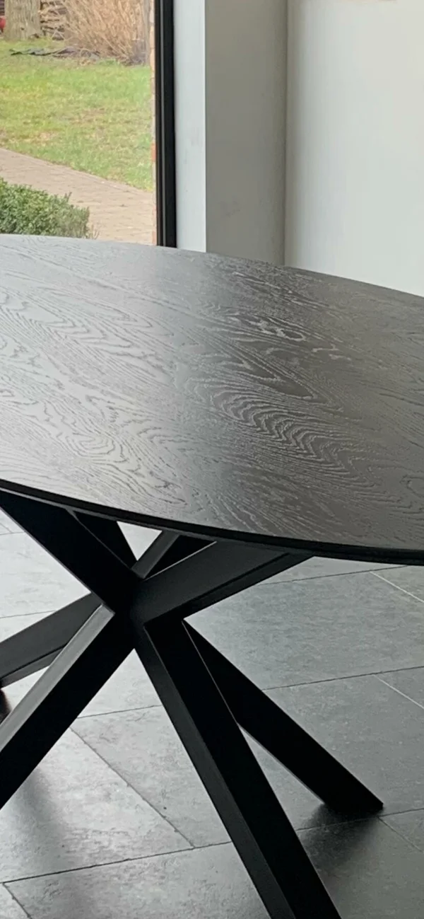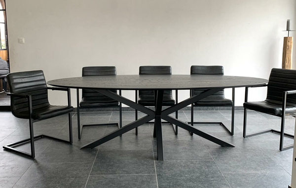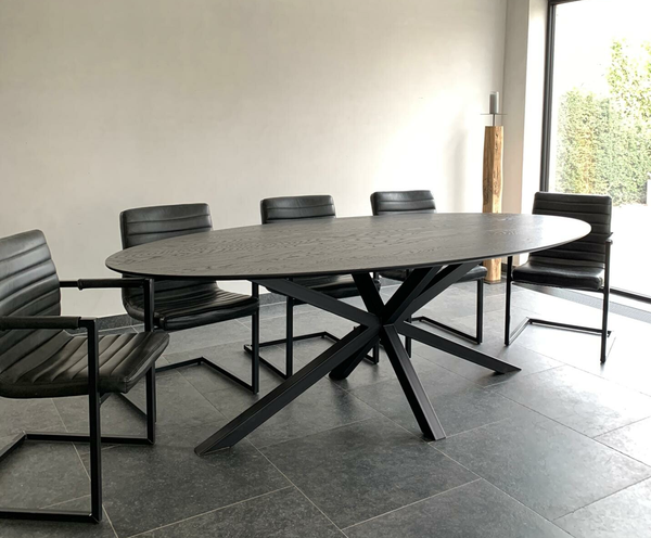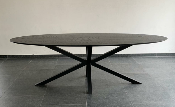 Eettafel Ovaal Black 3D in massieve eik. Bladdikte 2.5 cm met verjongde rand. Blad gelakt in RAL 9005. Hoogte 76 cm. Buisprofielen 60/60 mm. Afmetingen op foto: 240×110 cm. Maatwerk mogelijk.