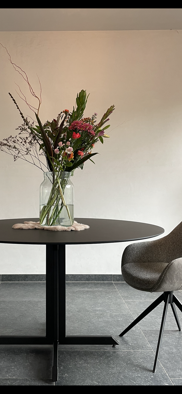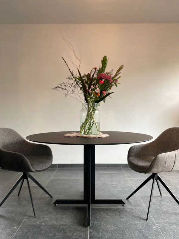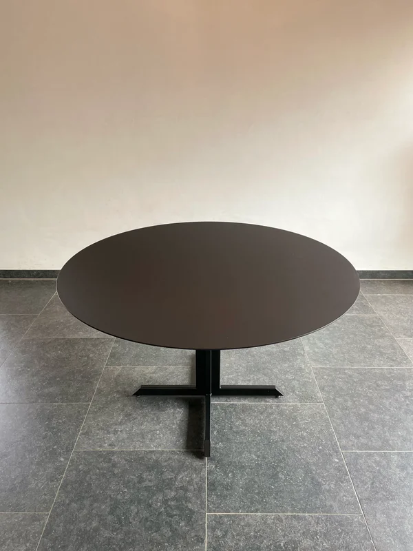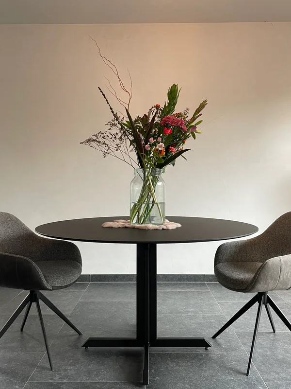 De ronde eettafel Fenix Julio is gemaakt van hoogwaardig Fenix HPL volkern, een duurzaam en krasbestendig materiaal. De tafel is uitgevoerd in de kleur Nero Ingo (zwart) en heeft een slank blad van 12 mm dik met een elegante verjongde rand. Dankzij de matte en anti-vingerafdruk afwerking blijft het oppervlak langdurig mooi en onderhoudsvriendelijk. Verkrijgbaar in diverse kleuren en volledig op maat te maken voor een perfecte match met jouw interieur.