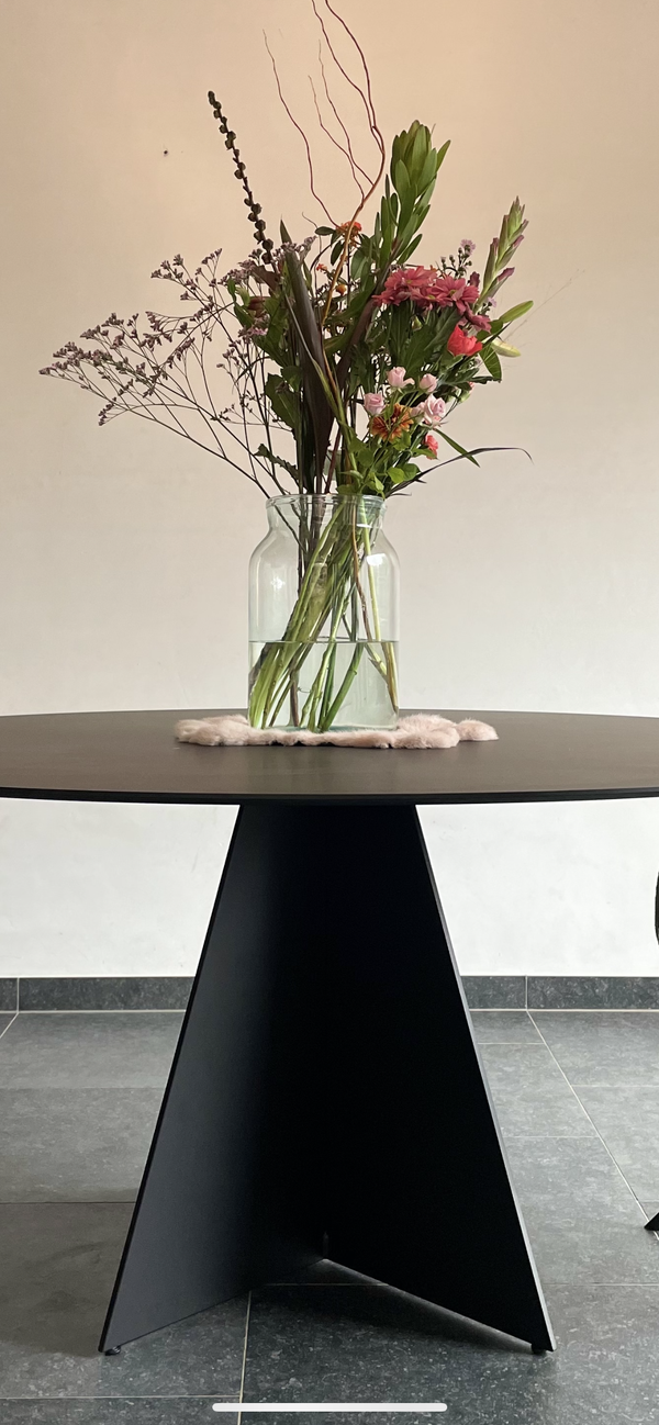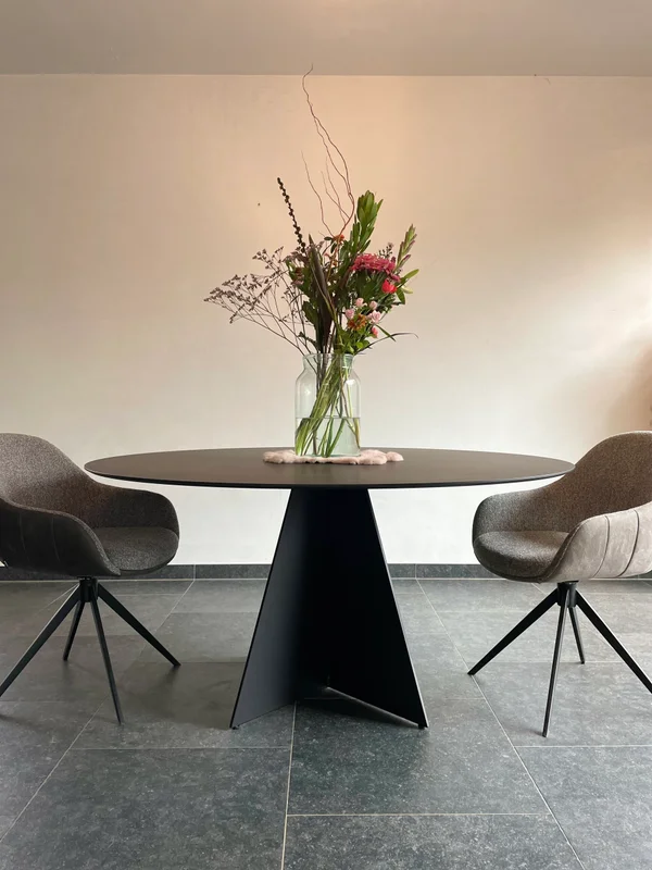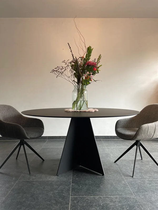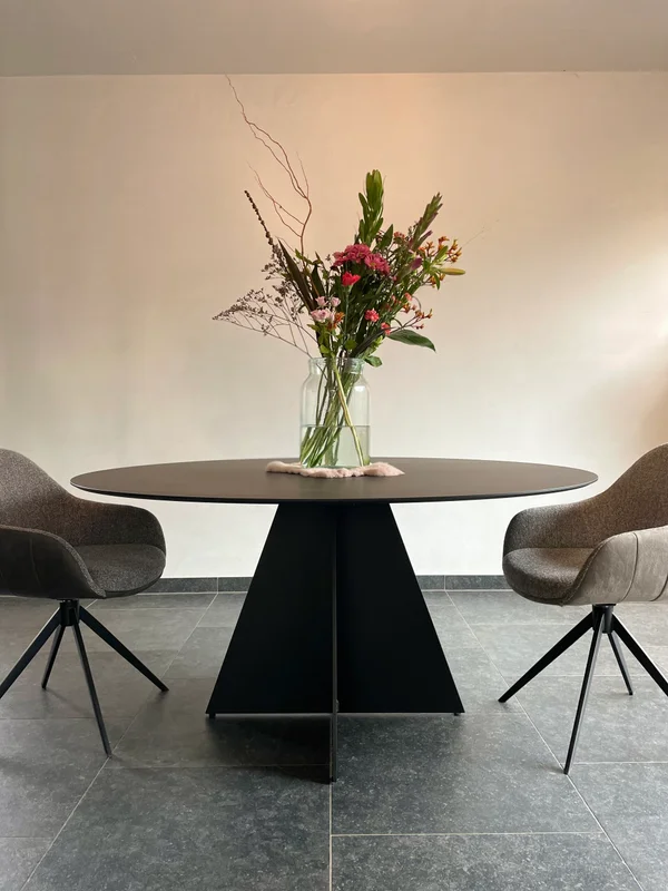 De ronde eettafel Fenix Roia is vervaardigd uit hoogwaardig Fenix HPL volkern, een krasbestendig en onderhoudsvriendelijk materiaal met een luxe uitstraling. Uitgevoerd in de kleur Nero Ingo (zwart), maar beschikbaar in een breed scala aan andere kleuren om perfect bij jouw interieur te passen. Het tafelblad heeft een slanke dikte van 12 mm met een verfijnde verjongde rand. Volledig op maat te maken voor een unieke en stijlvolle eetruimte.
