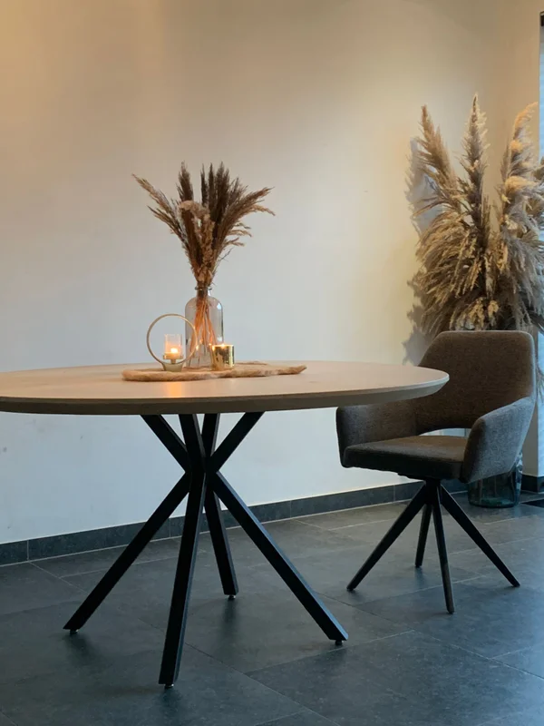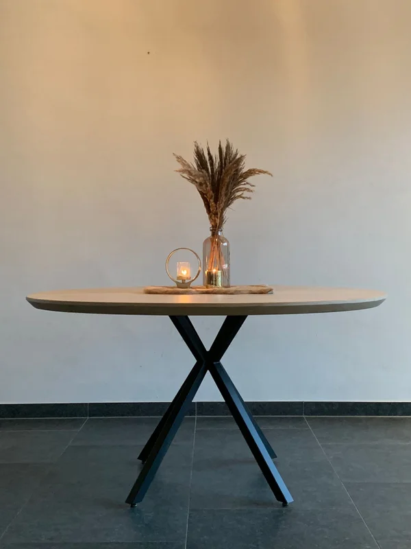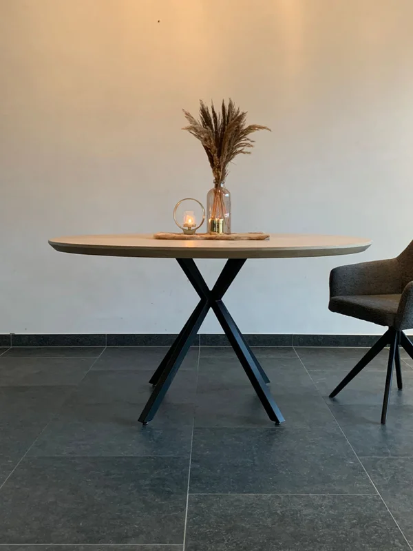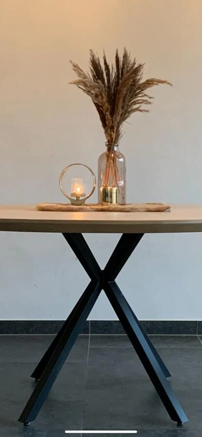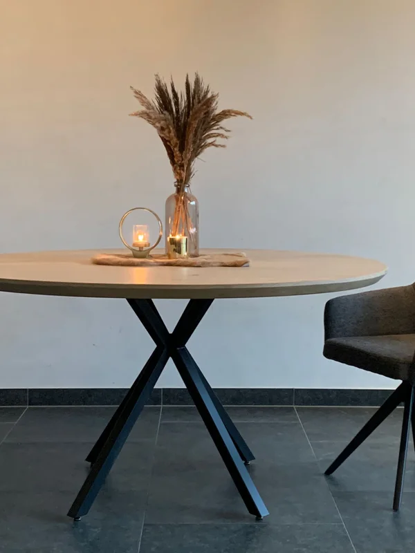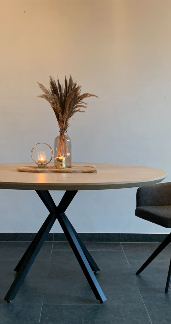 Ronde eettafel Madrid. Eettafel in massieve eik. Bladdikte 4 cm met verjongde rand. Onderstel 40/40 mm, gepoederlakt in fijne dia structuur. Blad behandeld met een 2-componenten coating. Maatwerk mogelijk. Wachttijd 4-5 weken.