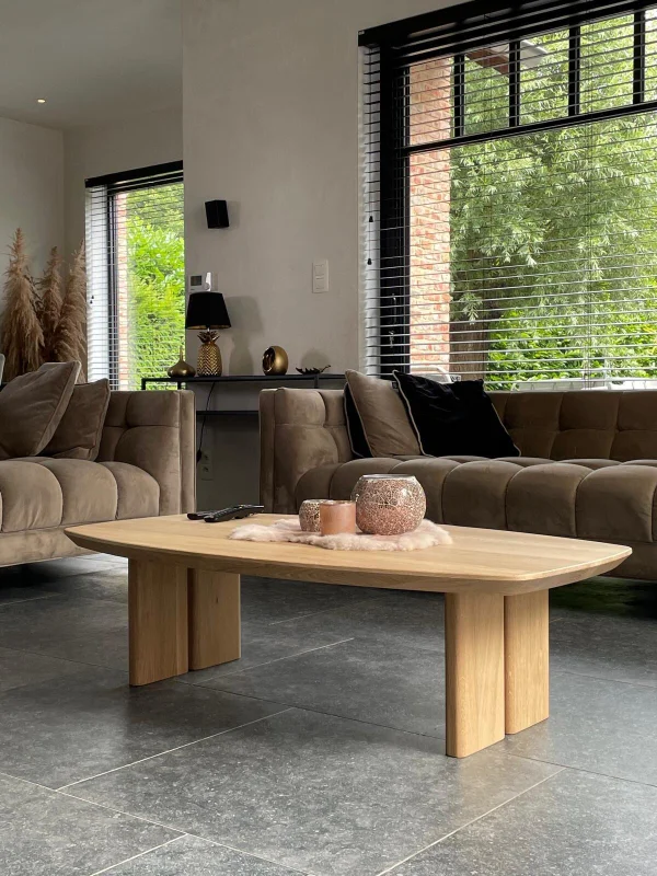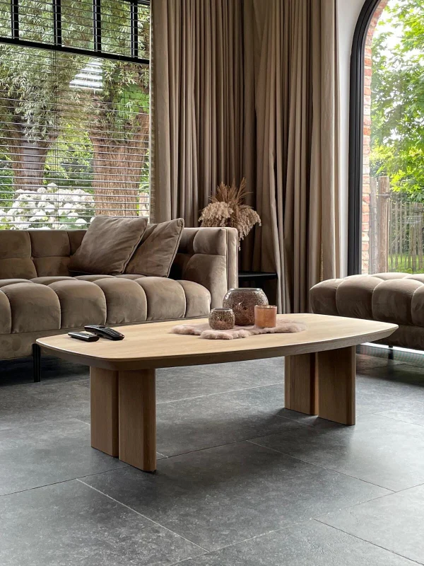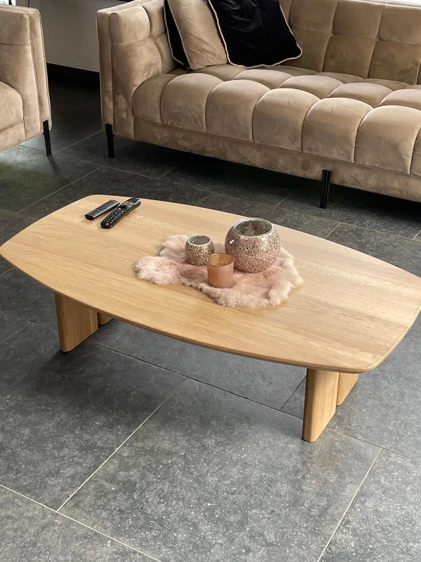 Salontafel Claire in Deens ovaal design, volledig vervaardigd uit massieve eiken. Behandeld met een matte parketvernis voor een natuurlijke, vet- en waterafstotende afwerking. Maatwerk mogelijk voor een elegant en tijdloos interieur.