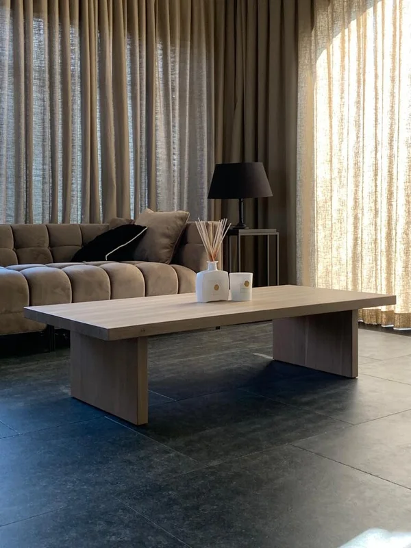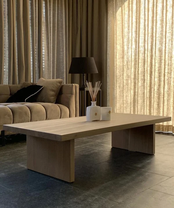 Salontafel Devine, volledig vervaardigd uit massieve eik met een stevige bladdikte van 4 cm. Het blad is behandeld met een 2-componenten coating voor een vet- en waterafstotende afwerking. Maatwerk mogelijk voor een perfecte afstemming op uw interieur. Afmetingen op foto: L 140 cm x B 70 cm x H 35 cm.