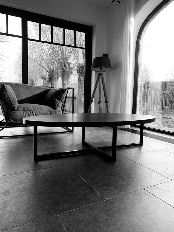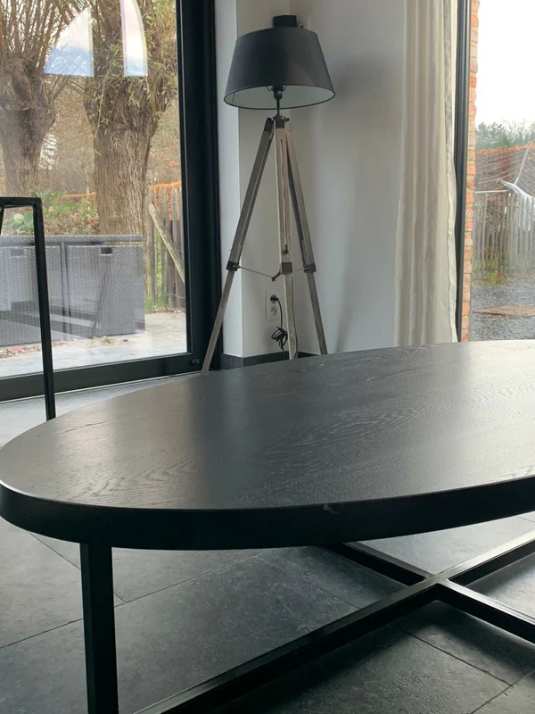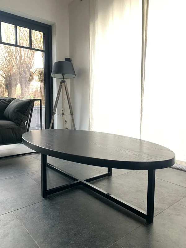 Salontafel Eclips in zwart gebeitst eiken, behandeld met krasvaste vernis voor een lange levensduur. De bladdikte is 4 cm, met stevige buisprofielen van 30/30 mm. Afmetingen op foto: 160×80 cm. Maatwerk mogelijk.