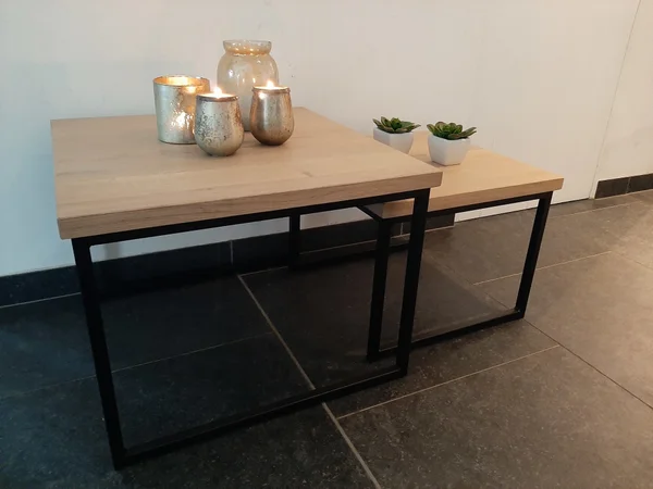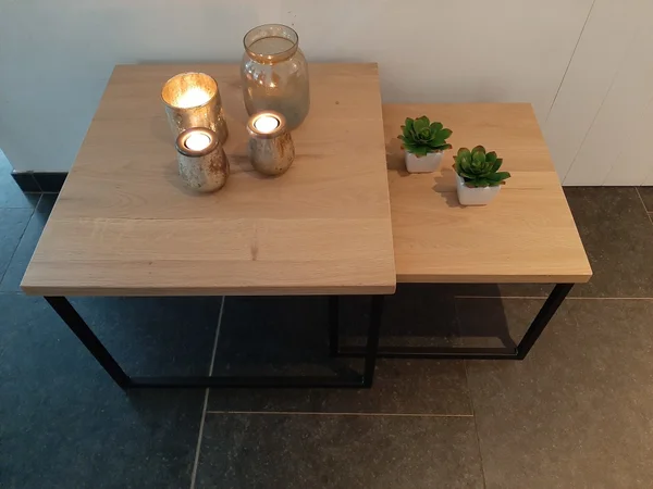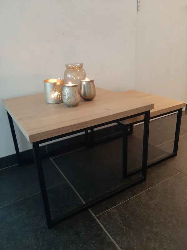 Salontafel in massieve eik, set van 2 stuks. Bladdikte 23 mm. Behandeld met een 2-componenten coating tegen vocht- en vetvlekken. Maatwerk mogelijk! Wachttijd 3 tot 4 weken.