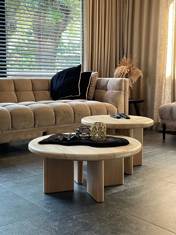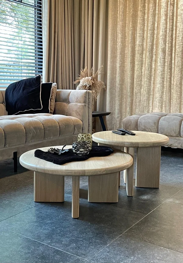 Salontafel Lagos, set van 2 stuks volledig vervaardigd uit massieve eik. Behandeld met een matte parketvernis voor een natuurlijke, vet- en waterafstotende afwerking. Maatwerk mogelijk voor een perfect passend design in uw interieur.