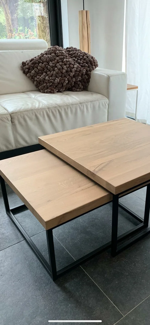 Salontafel set van 2 stuks in massieve eik, met bladdikte van 40 mm. Behandeld met een 2-componenten coating voor bescherming tegen vocht- en vetvlekken. Maatwerk mogelijk! Wachttijd: 3 tot 4 weken.