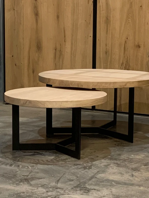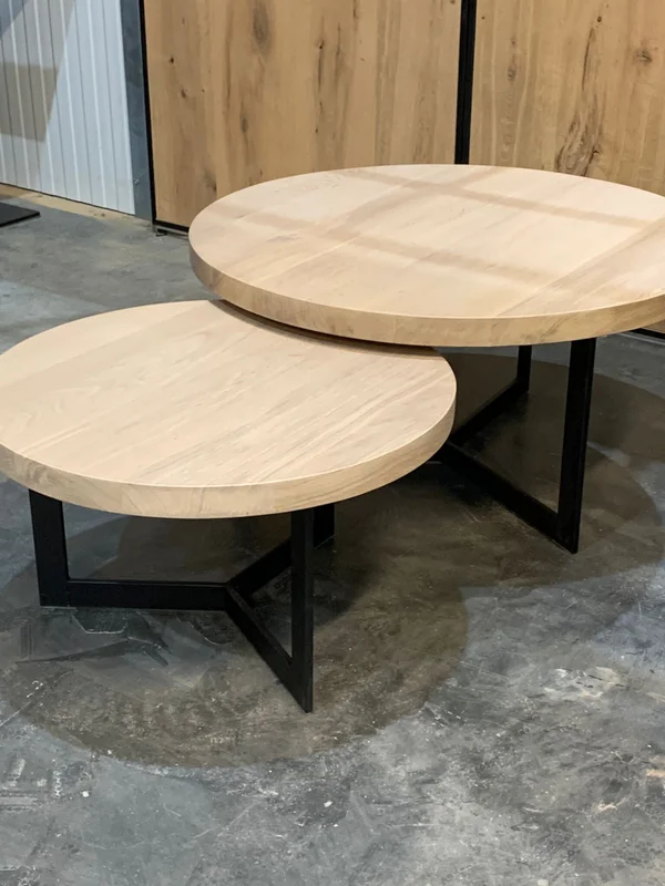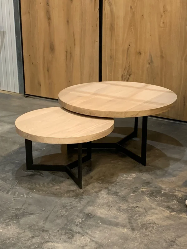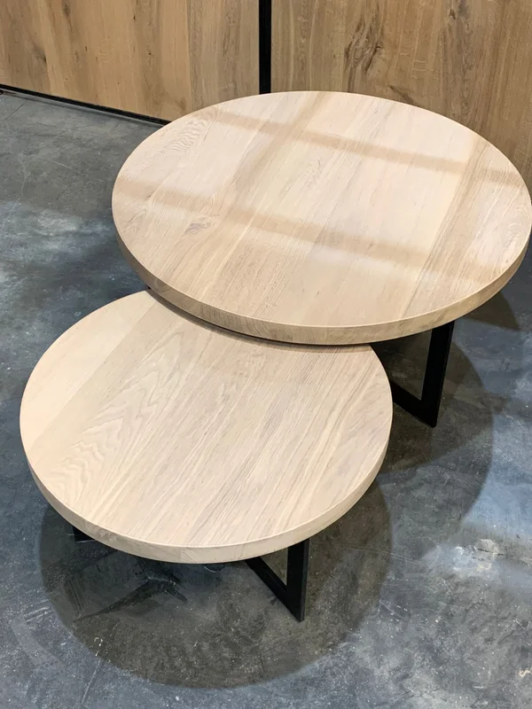 Salontafels Y Poot 40/10mm, gemaakt van massieve eik met een robuuste bladdikte van 4 cm. Het onderstel bestaat uit Y-poten van 40/10 mm vol staal voor een stoere en moderne uitstraling. Maatwerk mogelijk. Afmetingen op foto: D 80 cm (H 40 cm) + D 60 cm (H 34 cm).